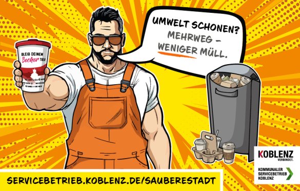 Unter dem Motto "Bleib deinem Becher treu!" gibt es an vielen Verkaufsstellen im Stadtgebiet den Koblenz-Becher zu erwerben. Zahlreiche Bäckereien und Cafés unterstützen den Mehrweg-Gedanken und befüllen mitgebrachte Kaffeebecher. Auf der Internetseite https://www.koblenz.de/bdbt sind die Stellen aufgelistet, wo Koblenz-Becher erworben und/oder befüllt werden können.